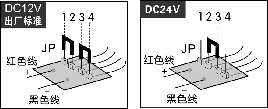 4、電磁門吸出廠時(shí)的標(biāo)準(zhǔn):工作電壓為DC12V 。如需使用在DC24V的系統(tǒng)中,請(qǐng)用跳線帽連接JP的第2腳與第3腳(如下圖調(diào)節(jié)方法)。