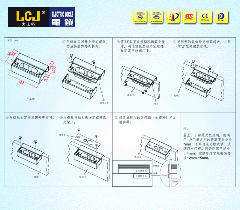 配套電插鎖EC200系列、EC200B系列與EC200A磁扣板,實施12~15mm的下無包邊玻璃門固定安裝 |